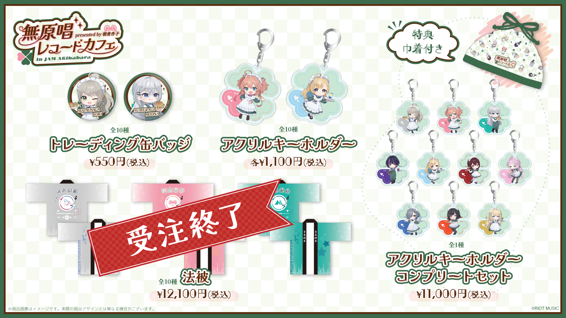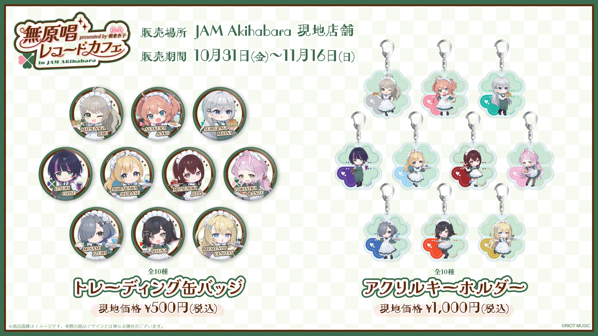 https://prcdn.freetls.fastly.net/release_image/44525/572/44525-572-748dbab1590fd8a702073c58af846d5b-1920×1080.png During the collaboration period, commemorative goods will be sold in limited quantities at a special price in JAM Akihabara. ・”Trading Can Badges (10 types)” ¥500 each (tax included) ・”Acrylic Keychains (10 types)” ¥1,000 each (tax included) *Sales will end once stock runs out. ▼ RIOT MUSIC OFFICIAL STORE – Product list