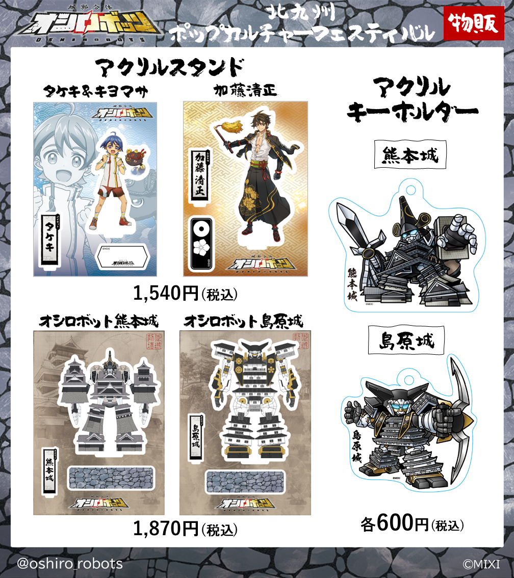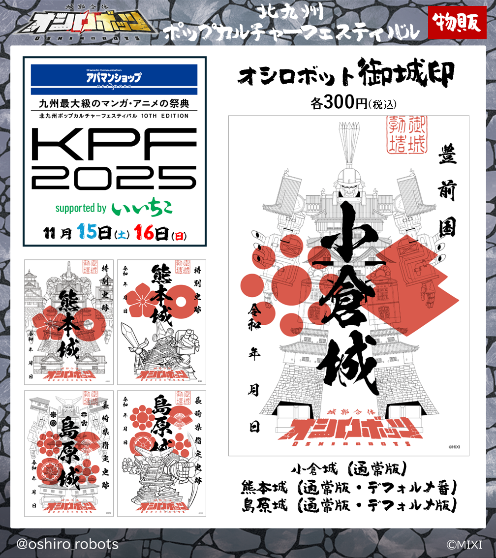 https://prcdn.freetls.fastly.net/release_image/25121/724/25121-724-3f83312cd0bc5da968d31ffade8a0279-1008×1134.png Oscillobot Castle Seal Regular version (Kokura Castle, Kumamoto Castle, Shimabara Castle)… ¥300 each (tax included) OsiRobot Castle Seal Deformed Version (Kumamoto Castle, Shimabara Castle)… ¥300 each (tax included) OsiRobot Acrylic Stand (Kumamoto Castle, Shimabara Castle)… ¥1,870 each (tax included) Takeki & Kiyomasa Acrylic Stand…1,540 yen (tax included), Kato Kiyomasa Acrylic Stand…1,540 yen (tax included) Acrylic Keychains (Kumamoto Castle, Shimabara Castle)…600 yen each (tax included) Logo T-shirt…2,800 yen (tax included), Castle Seal Book Mk-II…¥3,500 (tax included), Muffler Towel…¥2,200 (tax included) On the days of KPF2025 (November 15th and 16th), customers who spend ¥2,000 or more on eligible products at the “Castle Combination Oshirobots” booth will receive a