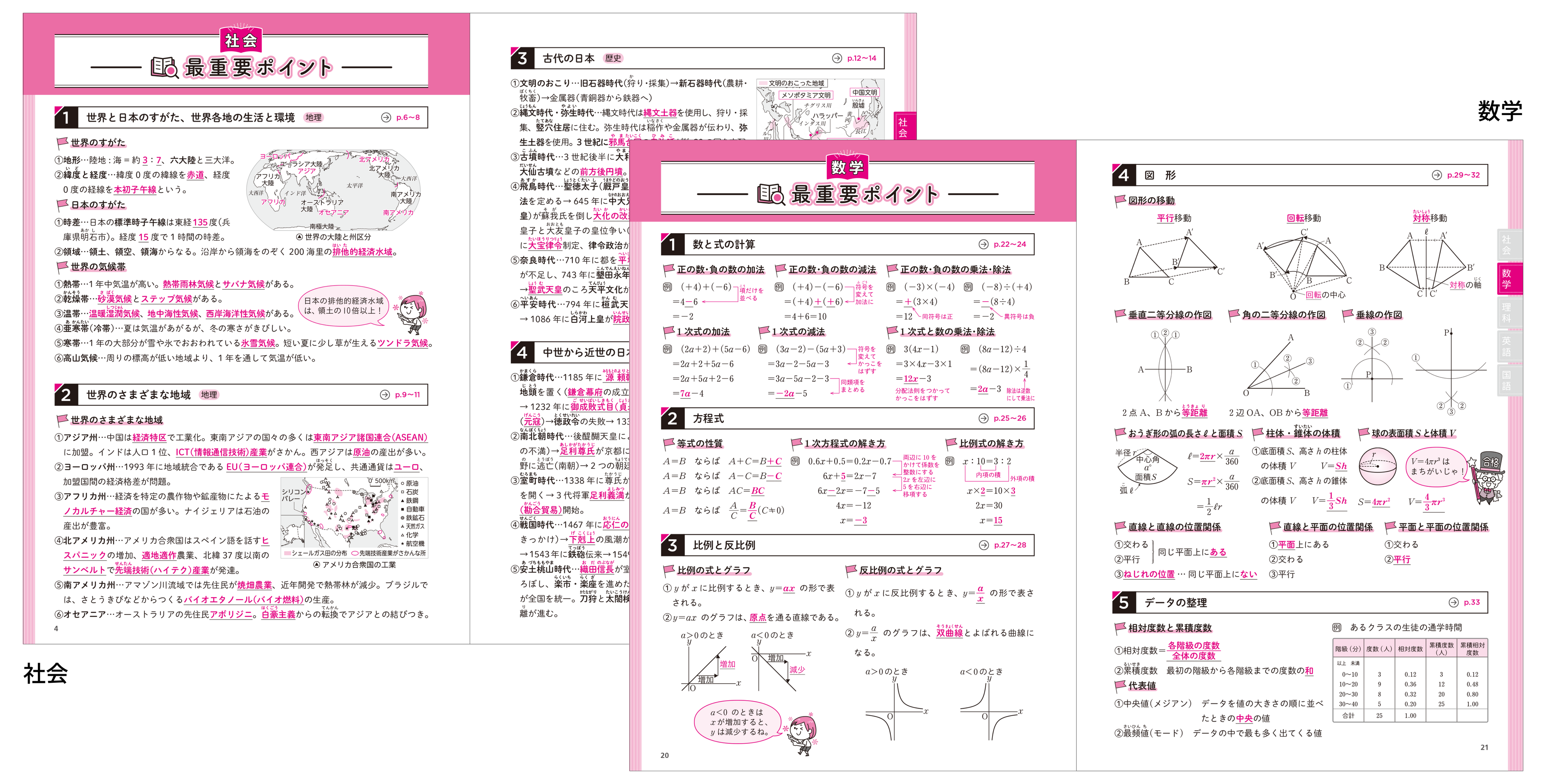 https://prcdn.freetls.fastly.net/release_image/43401/198/43401-198-a42348ce83314bb12ea8a3ab0998acdd-3900×1984.png 【Comprehensive Review Test for First-Year Junior High School Students】 We have included a “Comprehensive Review Test for First-Year Junior High School Students” at the end of each subject. The questions are based primarily on actual public high school entrance exam questions, so you can test your skills in preparation for the exam. ●You’re all set for moving on to the second year of junior high school! At the end of the book, there’s a page where original characters clearly explain preparations and strategies for the next grade.