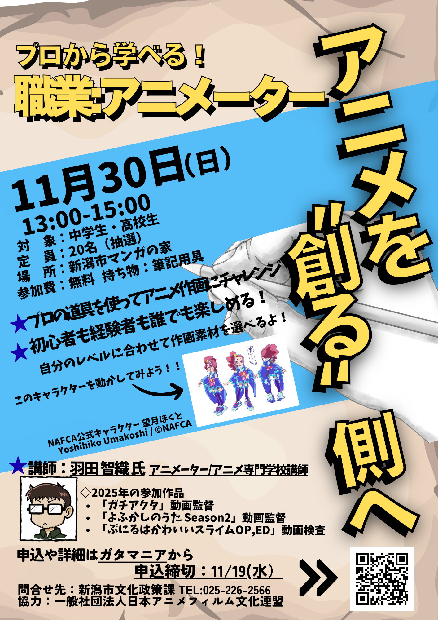 [Niigata City] Learn from the pros! “Occupation: Animator” held   Niigata City Press Release: October 31, 2025  Learn from the pros! “Occupation: Animator” Course Held The instructor is an animator who works on the production team of a popular anime! Middle and high school students interested in the world of anime! We’ll be hosting a workshop with an animator who works on popular anime as our instructor, where you can experience the reality of anime production, including drawing anime and learning about the appeal of the animator profession! If you’re interested in working in the anime industry or would like to hear from a professional, we look forward to receiving your applications!
