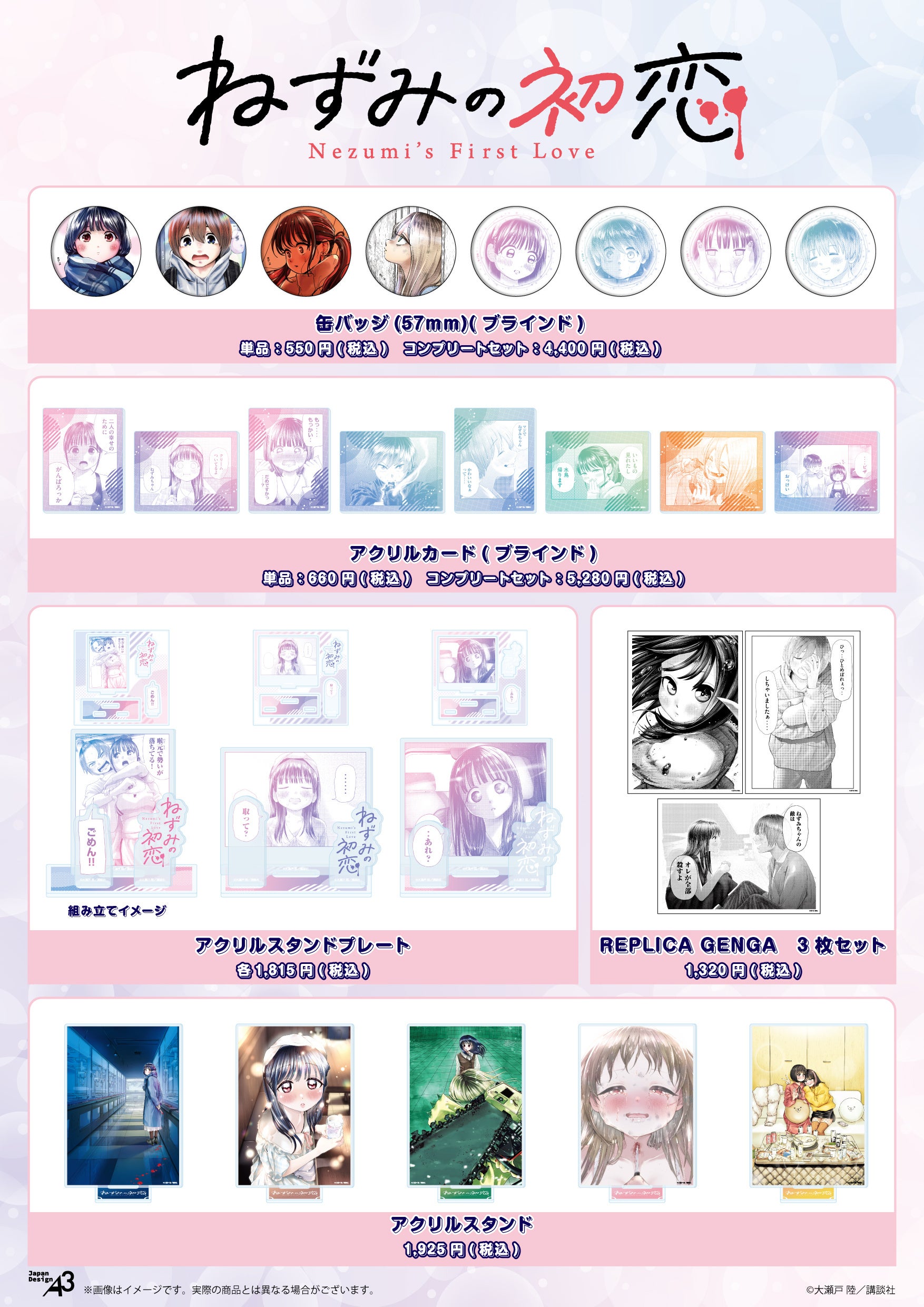https://prcdn.freetls.fastly.net/release_image/12048/1005/12048-1005-afd43611afd4f2df574059f089d270a2-1754×2480.jpg 【Goods List】 ・Can Badges (8 types) *Blind Box Product ・Acrylic Cards (8 types) *Blind Box Product ・Acrylic Stand Plates (3 types) ・REPLICA GENGA 3-Piece Set (1 type) ・Acrylic Stands (5 types) *For blind items, you can choose to purchase one random item as a single item, or a complete set that includes all types. Mail order also available! Purchasers receive a limited edition postcard (2 types) as a bonus.
