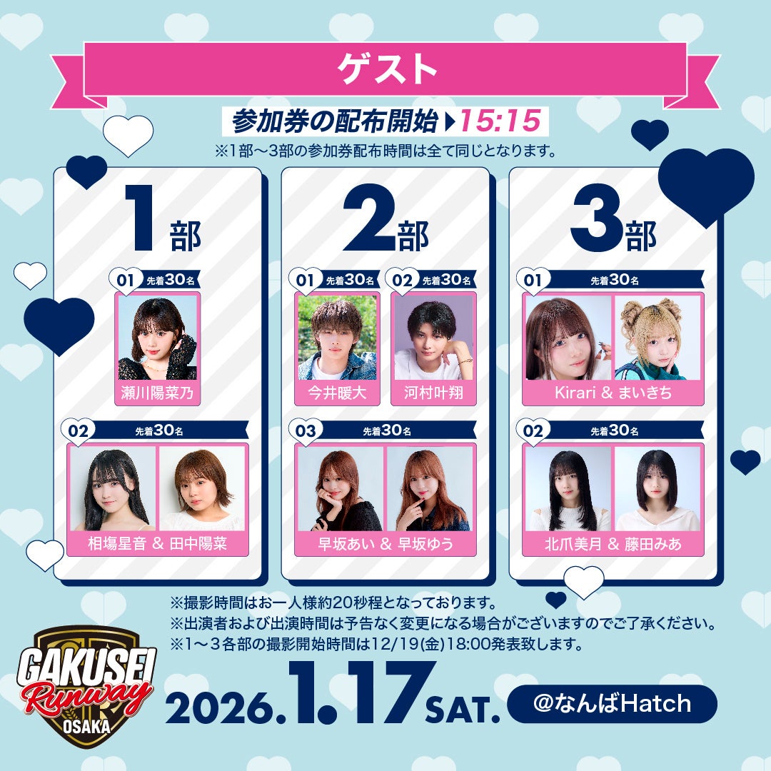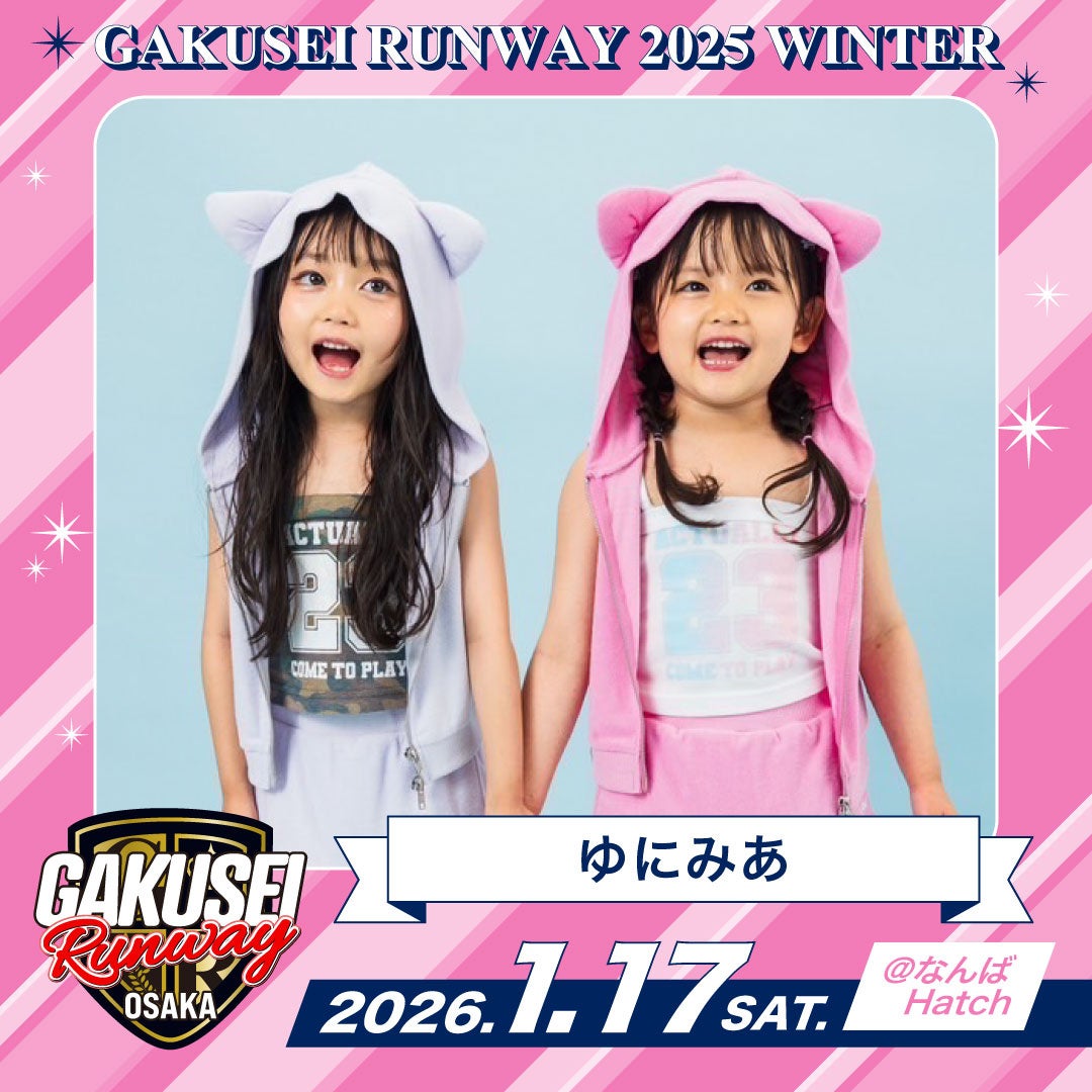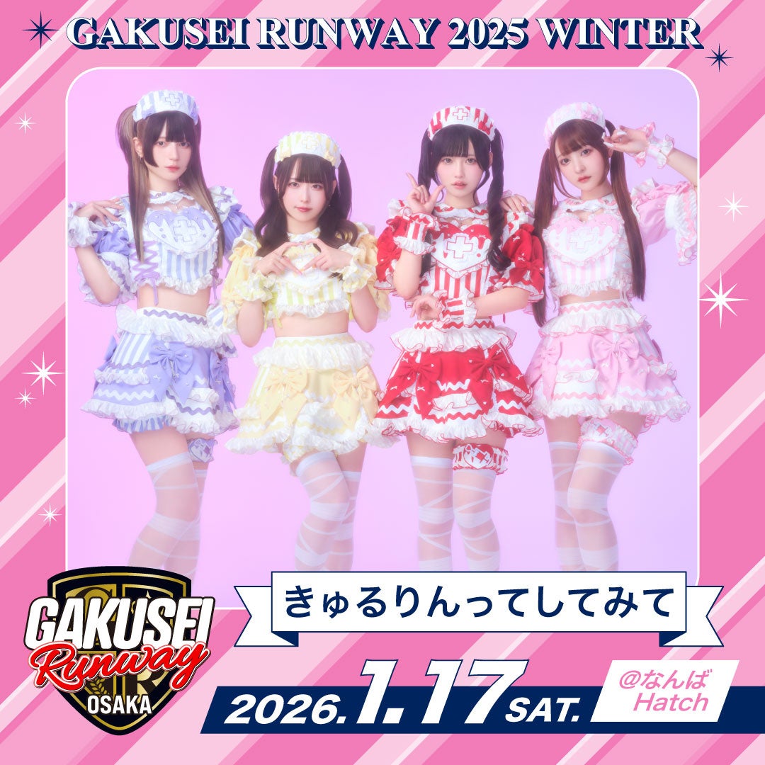 [Full performer information] As of October 31, 2025 *In alphabetical order 〈ARTIST〉 Try doing some ‘Kururin’, non-stop! 〈SPECIAL GUEST〉 Imai Harudai, Gamix, Kirari, Sho, Segawa Hinano, Terashima Kisaki, and someone with no name yet. , Hinata, Fujita Mia, Maikichi, Murakata Nonoka, MON7A, Unimia 〈GUEST〉 Aibara Seine, Akiyama Mizuki, Iinuma Torao, Ikukata Mio Sakura, Kawamura Kanasho, Kitazume Sakura, Kitazume Mizuki, Kidai, Kuroki Sena, Shoyanan, Seno Mahoko, Taotao Channel, Takahashi Kano, Tanaka Hina, Shirota Moeka, Tsuchiya Seirai, Hayasaka Ai, Hayasaka Yu , Hirai Koto, Maiyatsuan, Misaki, Mizobe Hikaru, Triplets, Ririka We will continue to announce performer information on the official website, so stay tuned!! ■Event overview Event name GAKUSEI RUNWAY 2025 WINTER Date: Saturday, January 17, 2026 Venue: Namba Hatch Organizer: Student Runway Office Content: Fashion shows, artist live performances, etc. Planning/Production: Kansai Collection ENTERTAINMENT Co., Ltd. Written by: Kansai Collection ENTERTAINMENT Co., Ltd. Media Partners: ABEMA, Model Press, Gakusei Shimbun, Baycom, LINE VOOM [Contact for this matter] GAKUSEI RUNWAY Office 5F Sankyo Yotsubashi Building, 1-11-1 Minamihorie, Nishi-ku, Osaka 550-0015 TEL (06) 6536-7787 / FAX (06) 6599-9803 *Please contact us at the above address if you have any requests for image data or any questions.
