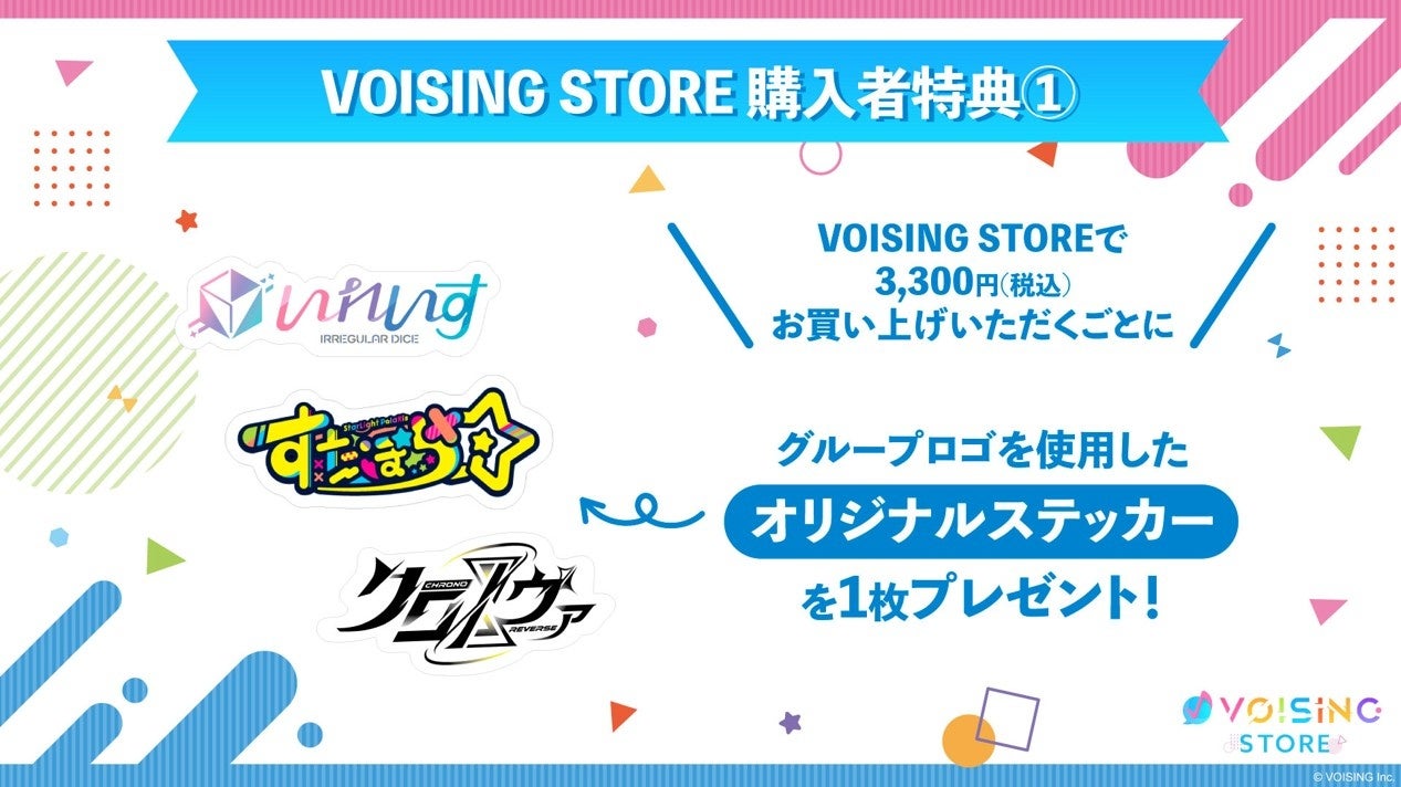 https://prcdn.freetls.fastly.net/release_image/115076/78/115076-78-00cb85145bd60678a7fdfdbf9724ff26-3900×1499.png ■ Must-see bonuses for fans are also available. Look forward to exclusive novelty items only available here. At “VOISING STORE in UMEDA,” we offer exclusive novelty items as a special gift for merchandise purchasers. 1. “Original Logo Stickers (3 Types)” Customers who spend a total of 3,300 yen or more (tax included) at the “VOISING STORE in UMEDA” will receive a free group logo sticker featuring “Ireice,” “Stapora,” or “Cronova.” *You can choose one of the three types at the time of payment.