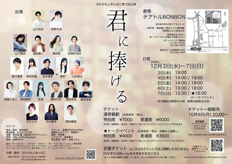https://prcdn.freetls.fastly.net/release_image/13972/3358/13972-3358-988cb5794fcfabb9de183ae26e81b7df-800×567.jpg “Dedicated to You,” hosted by Buta no Chokinbako, will be held from Wednesday, December 3, 2025 The play will be performed at Theatre BONBON (3-22-8 Nakano, Nakano-ku, Tokyo) on Sunday, December 7, 2025. Tickets are on sale now at Confetti (operated by Long Run Planning Co., Ltd., Shinjuku-ku, Tokyo, CEO: Daigo Kurematsu). Tickets here  Official website