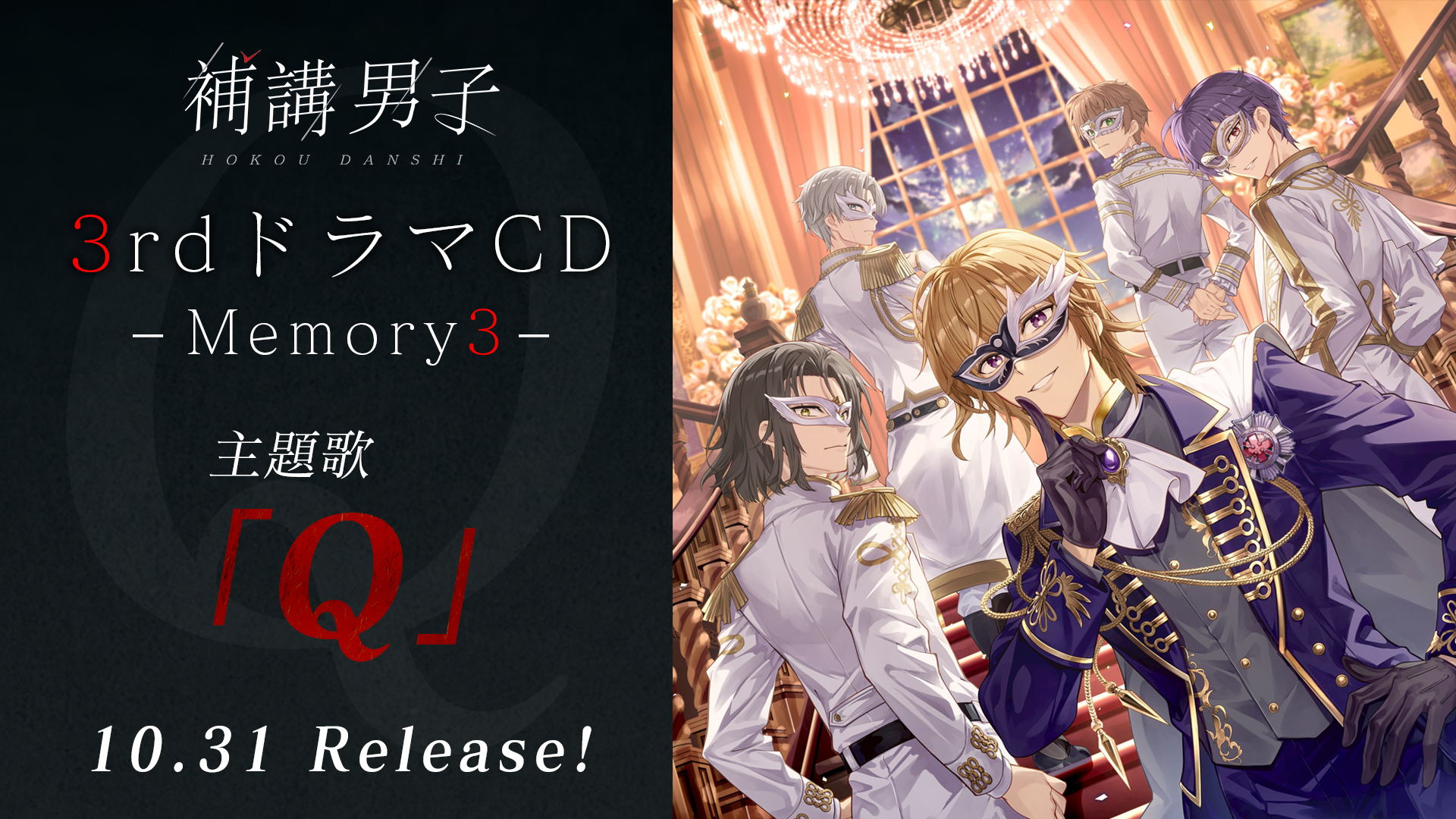 https://prcdn.freetls.fastly.net/release_image/101562/575/101562-575-64313fb5eb9ec8f37150bf4aa3adef9e-1920×1080.png 10/31 (Friday) “Q” / WITHPER release [Song Overview] “Q” Theme Song for “Jikyuu Danshi 3rd Drama CD ~Memory 3~” Sung by: WITHPER (Haruhito Fujishiro (CV: Yusuke Kobayashi), Makoto Kashiwatani (CV: Masato Toyoshima), Machi Do (CV: Hayato Dojima), Reiyo Kishi (CV: Nobuhiko Okamoto), Yoshiya Chayamachi (CV: Fumiya Imai)) Lyrics: Mayumi Kaneko Composer: Daichi, Rei Mizutani Arrangement & Music Programming: Hiroshi Sasaki Music Video