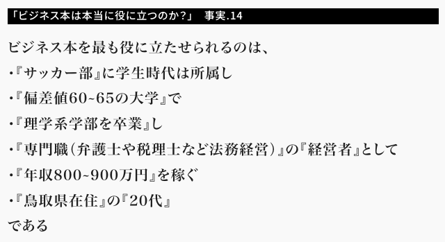 Ritsumeikan University – Number of questions: 50 (occupation, club activities, personality, reading habits, annual income, etc.) ■ Results (Partial Excerpt) ●42% of people found business books “helpful” Surprisingly, the results were “less than half.” However, there were many who were “unsure,” revealing that the results vary greatly depending on how the book is read and used. ●The factor that increases annual income is not “how many books you can read” but “how many times you reread them.” The average annual income of people who “read business books quickly and repeatedly” is 9.23 million yen. On the other hand, the average annual income of people who “only read once” is 4.27 million yen. It appears that reading speed and repetition ability may be directly linked to results. ●Soccer club members can make use of business books, but after-school club members cannot Statistical results show that members of sports clubs are more likely to say that business books are “useful.” In particular, it can be assumed that soccer club members’ flexible decision-making and teamwork skills are easily applicable to business. ●Among people who go to drinking parties, those who don’t read business books have an annual income 68,720 yen higher. Surprisingly, among people who “attend drinking parties at least once a month,” those who don’t read business books score higher on the “I’m proud of my work” scale. Whether you’re “learning through reading” or “learning from seniors at drinking parties,” the essence of learning is the same—just the means of gathering information are different.
