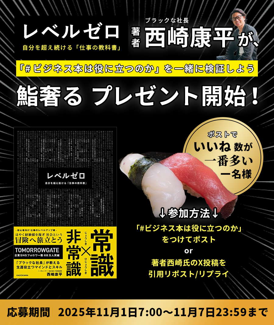 “#AreBusinessBooksUseful?”, which combines statistics and business. 1. We’ll treat you to a sushi dinner if you think you can make the most of a business book (Limited to one person) ・Application period: November 1, 2025 (Sat) 7:00 to November 7, 2025 (Fri) 23:59 ・Result announcement: Until Friday, November 14, 2025 ・Qualifications: Those who fit the attributes identified in the survey that make the most use of business books [member of the soccer club in school, graduated from a science department at a university with an academic ability score of 60-65, and are in their 20s] and who have posted a post with the hashtag “Are business books useful?” or a quote/reply to Nishizaki’s X post stating that they fit the criteria. ・Benefit: One lucky winner will be selected from among those who meet all conditions. 2. We’ll treat you, a social media lover, to a delicious sushi meal (limited to one winner) ・Application period: November 1, 2025 (Sat) 7:00 to November 7, 2025 (Fri) 23:59 ・Result announcement: Until Friday, November 14, 2025 ・Conditions: Post with “Are Business Books Useful?” or “Quote Repost/Reply” to Nishizaki’s X post ・Benefits: The winner who meets all conditions and receives the most likes 3. Free lunch invitation (limited to 10 people) Application period: November 1, 2025 (Sat) 7:00 AM – November 7, 2025 (Fri) 11:59 PM ・Results will be announced by Friday, November 14, 2025 ・Conditions: Posts tagged with “Are Business Books Useful?” Or those who “quoted/reposted/replied” to Nishizaki’s X post ・Benefit: Those who meet all conditions and receive the 2nd to 11th most likes