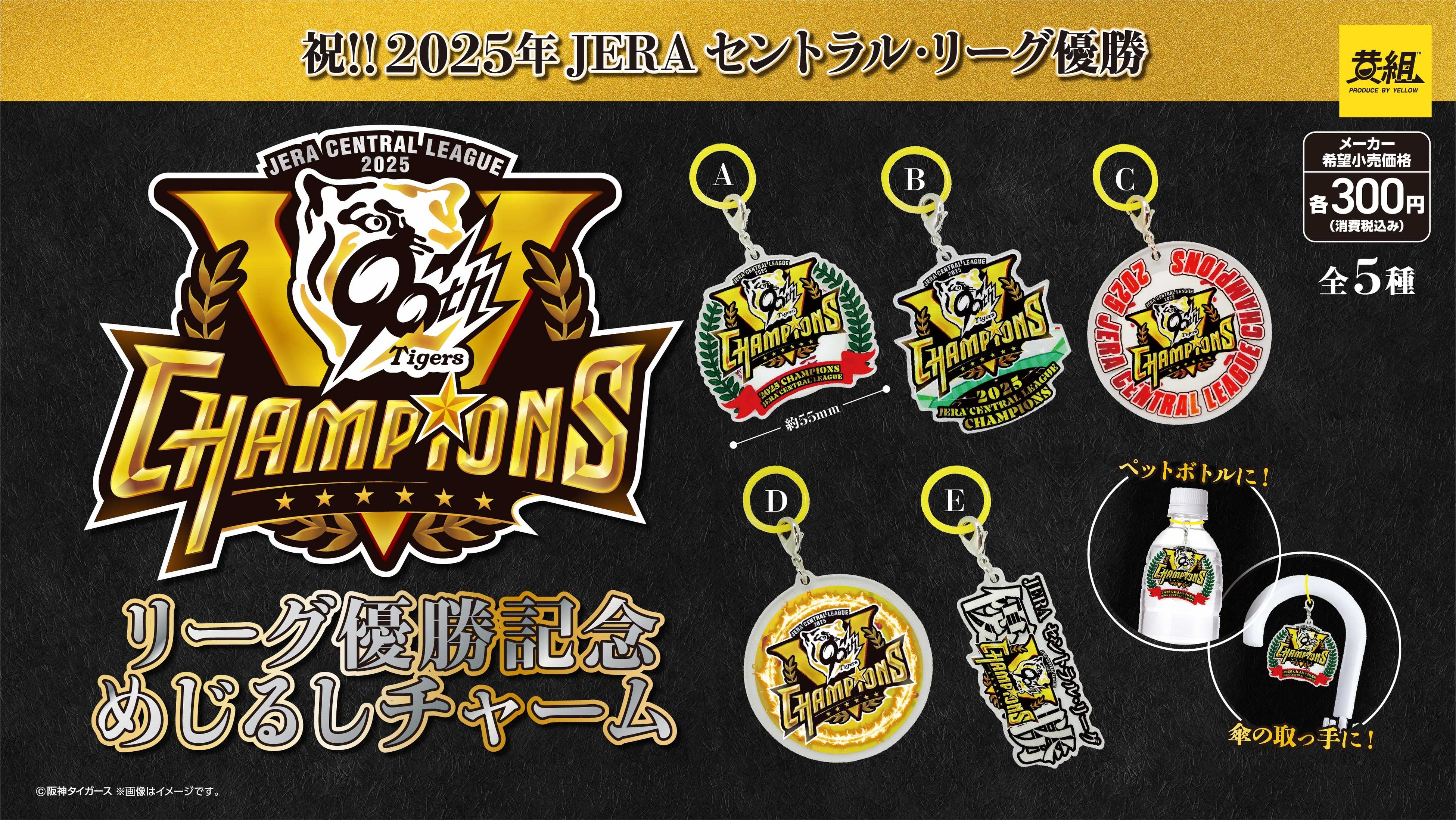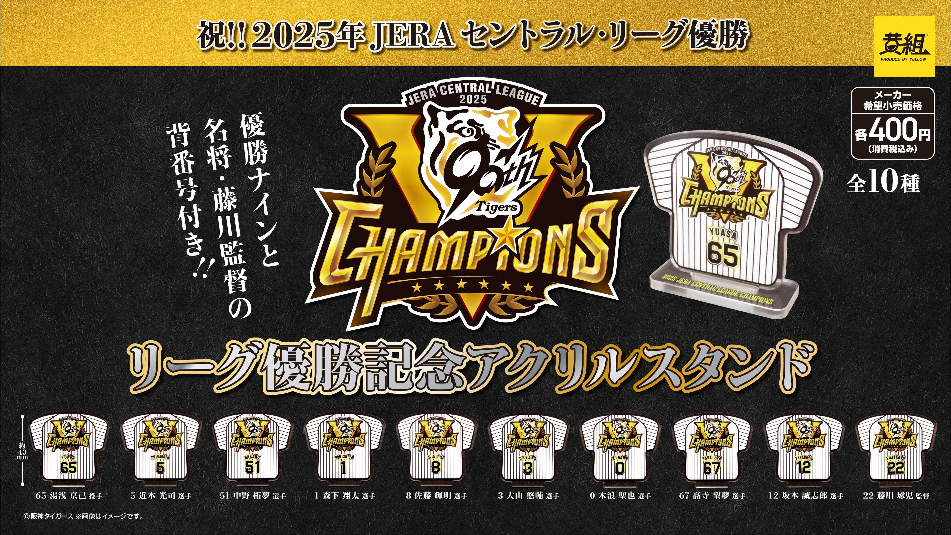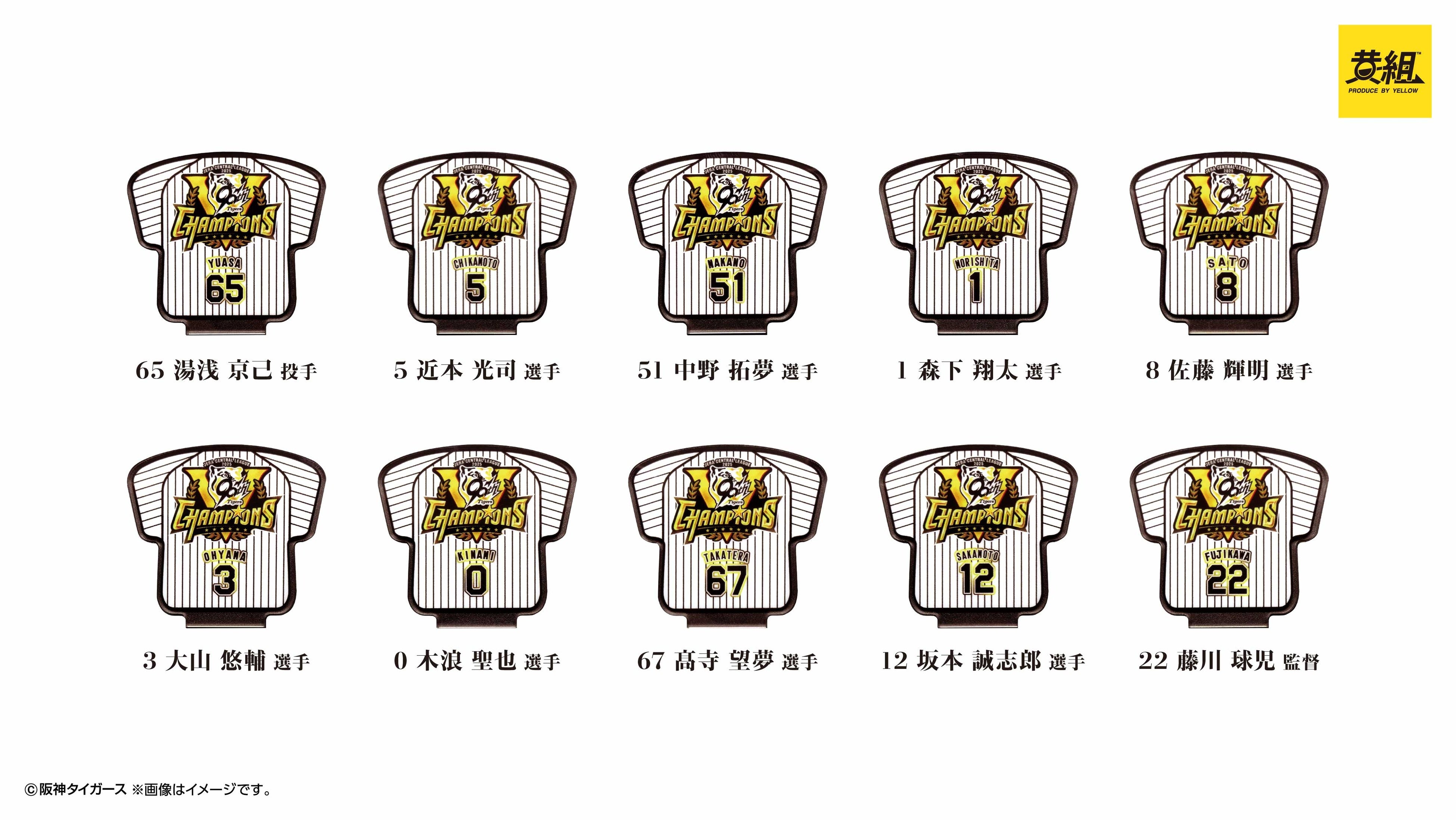 Yellow Co., Ltd. Press release: November 1, 2025 To Members of the Press [Congratulations to the Hanshin Tigers] 2025 JERA Central League Championship Commemorative Merchandise Now on Sale! ~Announcement of the release of “Can Badges,” “Acrylic Stands,” and “Sign Charms”~ The long-awaited “championship commemorative goods” are here! We have a wide lineup of items you can enjoy in your daily life! Special edition goods featuring the uniform numbers of the winning nine players and Manager Fujikawa are also available.