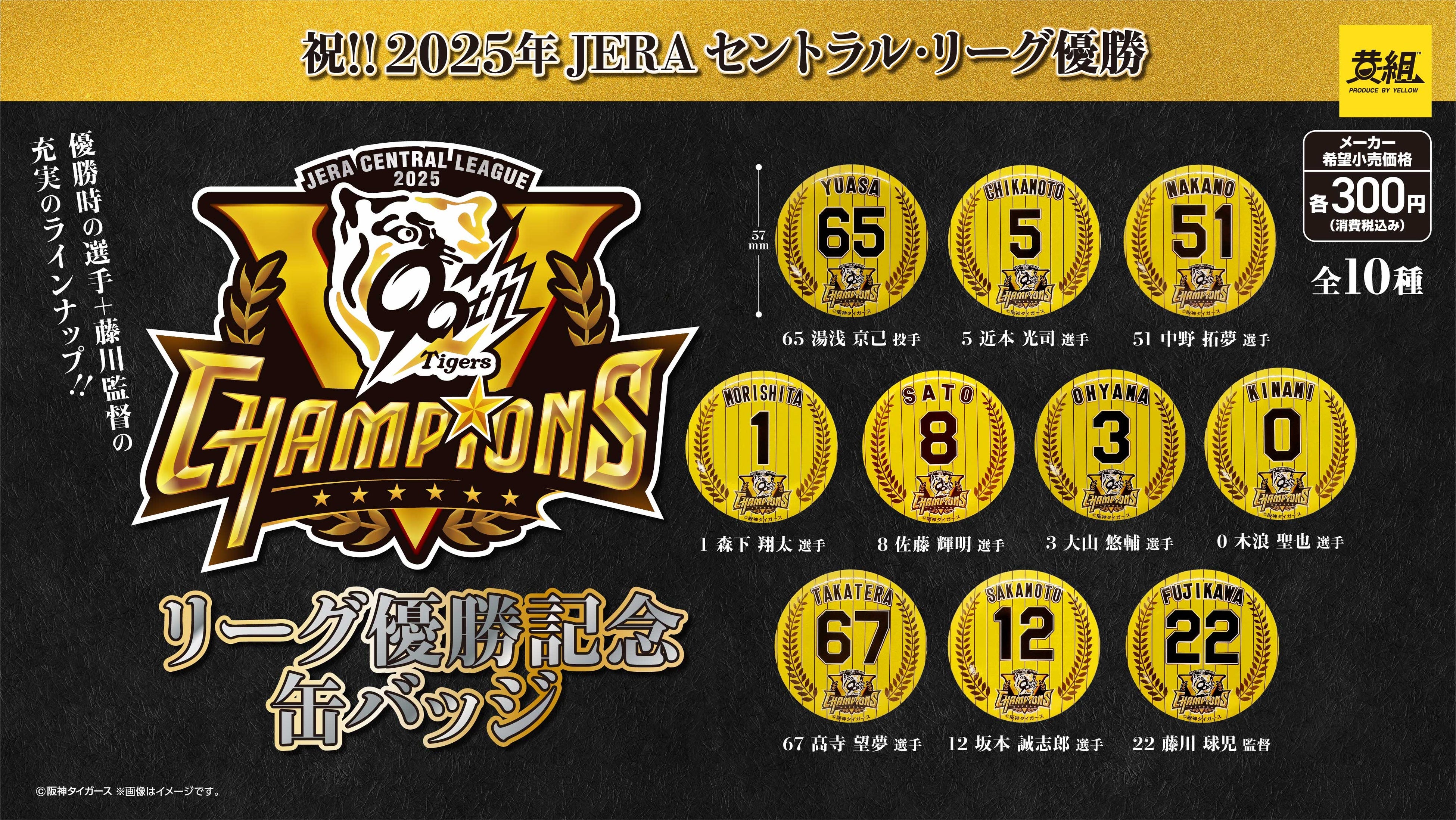 https://prcdn.freetls.fastly.net/release_image/56550/796/56550-796-08f3282b4b7672c247a286dcdee2aef0-3900×2196.jpg Yellow Co., Ltd. (Headquarters: Shibuya-ku, Tokyo; Representative Director: Eiichiro Sakazaki; hereinafter “Yellow”), which handles the OEM business for domestic and international brands, including the planning, manufacturing, and sales of fashion and apparel accessories, will be selling “championship commemorative goods” to celebrate the Hanshin Tigers’ 2025 JERA Central League championship and honor the heroic performance of the players who fought so hard. Product features ■Hanshin Tigers JERA Central League Championship Commemorative Button Badges (10 types total) Badges commemorating the Hanshin Tigers’ 2025 Central League championship are now available. This extensive lineup includes not only the uniform numbers of the players who won the championship, but also Manager Fujikawa’s! A stylish design that can be attached to a bag or cap!
