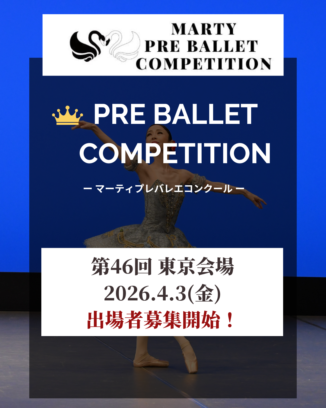Marti Pre Ballet Competition Vol. 46 in Tokyo [Date] Friday, April 3, 2026 [Venue] Koto Ward Cultural Center [Access] 5-minute walk from Exit 1 of Toyocho Station on the Tokyo Metro Tozai Line [Other details and