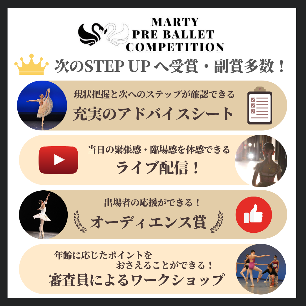 application]https://www.ballet-pre-competition.com/vol-41-芦屋-2025年12月/ Marty Pre Ballet Competition The Marti-Ple Ballet Competition comprehensively evaluates fundamental ability, musicality, physical ability, artistry, and technique. It provides opportunities for promising ballerinas to take the next step in their careers and supports them. HP ➤https://www.ballet-pre-competition.com/ Instagram ➤https://www.instagram.com/marty.ballet.competition/