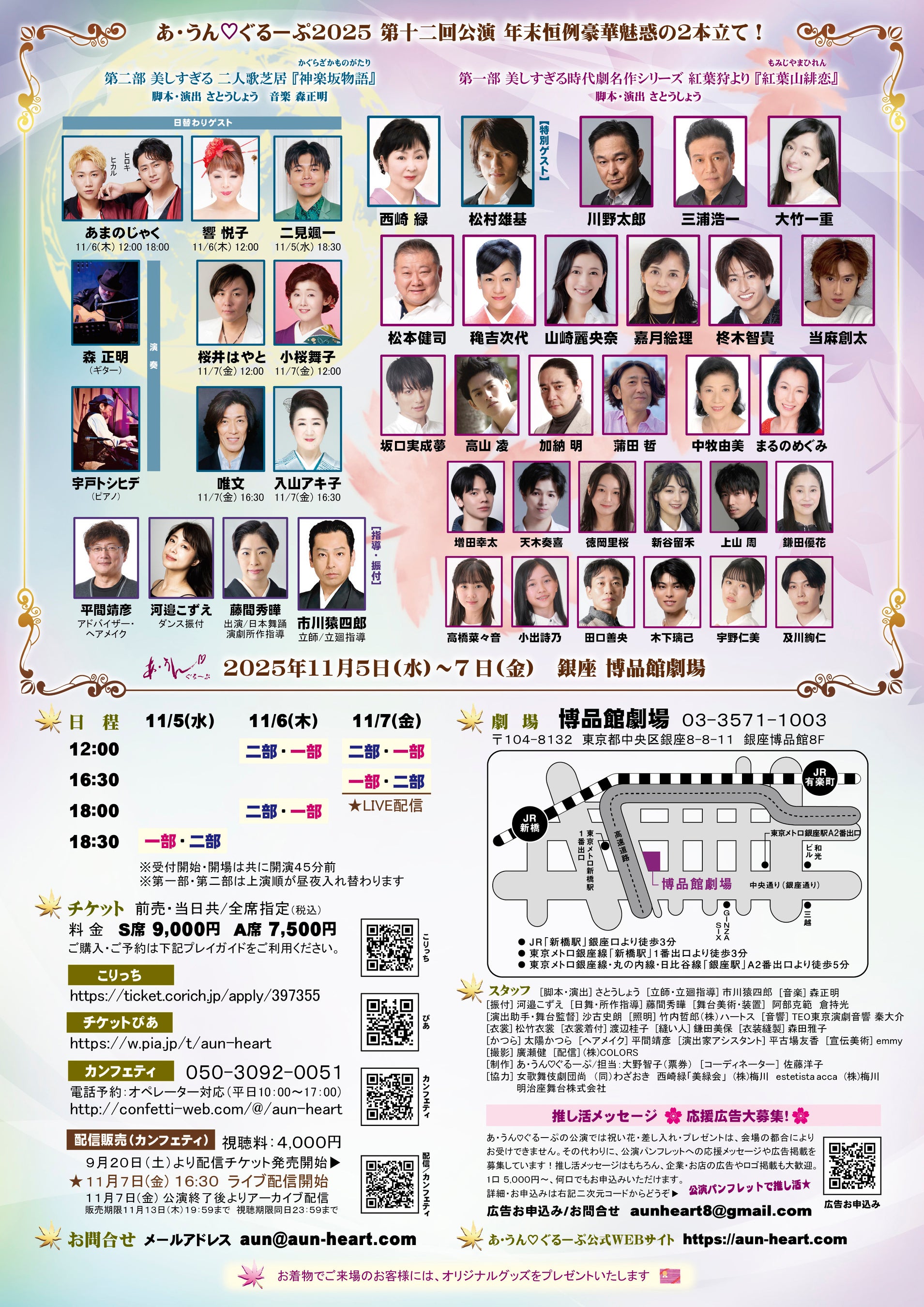 https://prcdn.freetls.fastly.net/release_image/13972/3373/13972-3373-8cbe5cd753197454c84da79ab87d8d45-1909×2700.jpg Sponsored by the A-Un (Heart) Group, the 12th A-Un (Heart) Group 2025 performance, the annual end-of-year extravagant and enchanting double feature “Momijiyama Hikoi” and “Kagurazaka Monogatari,” will be performed at Hakuhinkan Theater (8-8-11 Ginza, Chuo-ku, Tokyo) from Wednesday, November 5, 2025 to Friday, November 7, 2025. Tickets are on sale now at Confetti (operated by Long Run Planning Co., Ltd., Shinjuku-ku, Tokyo, Representative Director: Daigo Kurematsu). Tickets on sale now at Confetti Official homepage http://aun-heart.com/ It’s finally opening! A Beautiful Period Drama at the Ginza Hakuhinkan Theater A-Un (Heart) Group’s 12th Performance: “Momijiyama Hirenai” and “Kagurazaka Monogatari” A-Un Group’s 12th performance, “Momijiyama Hikoi” and “Kagurazaka Monogatari,” will finally open at the Ginza Hakuhinkan Theater on Wednesday, November 5th. The first part, “Momijiyama Hiren,” is a tale of passionate love and reincarnation based on the kabuki dance “Momijigari.” The second part, “Kagurazaka Monogatari,” is a musical, human-interest play set in the entertainment district of Kagurazaka, depicting human kindness and bonds. Script and direction by Sho Sato. Starring Kazue Otake, Sota Toma, Koichi Miura, and Taro Kawano in “Momijiyama Scarlet Love,” Midori Nishizaki and Yuki Matsumura in “Kagurazaka Monogatari,” and a star-studded cast, featuring guest singers who change daily. Under the theme of “Bringing Japanese beauty and spirit to the modern era,” we present “beautiful period dramas” and “musical plays” that combine the beauty of traditional performing arts with modern sensibilities. Performance Details and Cast 【Part 1】 A Beautiful Period Drama “Momijiyama Scarlet Love” from the Masterpiece Series: Momijigari (Titles omitted) Kazue Otake, Sota Touma, Megumi Maruno, Hideaki Fujima, Yumi Nakamaki, Tomoki Hiiragi, Eri Kazuki, Kenji Matsumoto, Reona Yamazaki, Tsuguyo Akiyoshi Tetsu Kamata, Akira Kano, Ryo Takayama, Minoru Sakaguchi, Yuka Kamata, Kanaki Amaki, Shu Kamiyama, Ruuka Shintani, Rio Tokuoka Kota Masuda, Ayane Oikawa, Hitomi Uno, Riki Kinoshita, Yoshio Taguchi, Shino Koide, Nanane Takahashi Koichi Miura, Taro Kawano 【Part 2】 A Beautiful Two-Person Song Play “Kagurazaka Monogatari” Masaaki Mori (guitar), Toshihide Uto (piano) Midori Nishizaki Yuki Matsumura 11/5 (Wed) 18:30: Soichi Futami Thursday, November 6th, 12:00: Etsuko Hibiki and Contrary / 18:00: Contrary Friday, November 7th, 12:00: Maiko Kozakura and Hayato Sakurai / 16:30: Akiko Iriyama and Yufumi Performance Overview A-Un (Heart) Group 2025 12th Performance: The Annual Year-End Luxurious and Enchanting Double Feature “Komijiyama Hikoi” “Kagurazaka Monogatari” Performance period: November 5, 2025 (Wednesday) – November 7, 2025 (Friday) Venue: Hakuhinkan Theater (8-8-11 Ginza, Chuo-ku, Tokyo) ■Performance Schedule Wednesday, November 5th, 6:30 PM Play/Song November 6th (Thursday) 12:00 Song/Play November 6th (Thursday) 18:00 Song/Play Friday, November 7th 12:00 Singing & Playing Friday, November 7th, 4:30 PM Playing & Singing *Reception and doors open 45 minutes before the start of each performance. *The order of