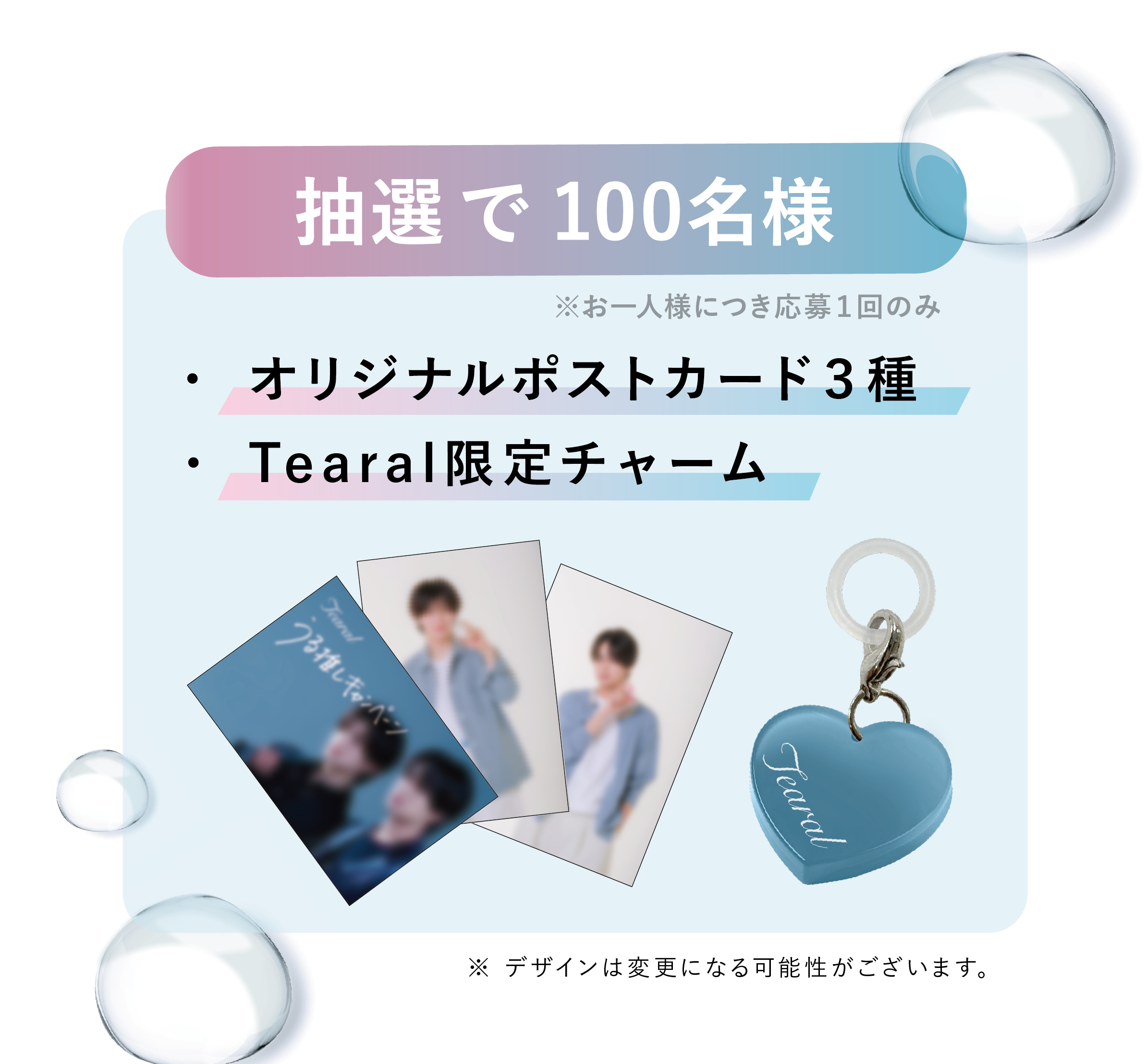 https://prcdn.freetls.fastly.net/release_image/12002/862/12002-862-c7a8f206d5f12c3d340f88440d173c65-1772×1111.png Implementation details 1. Receipt Entry Campaign Receipt Eligibility Period: Saturday, November 1, 2025 – Saturday, January 31, 2026 How to Apply – Purchase a Tearal eligible product at a drugstore, variety store, or general merchandise store nationwide, then upload the eligible receipt and enter your personal information on the special campaign website to complete your application. *Even if the packaging is different, if the product has the same contents, it will be considered the same product and one application will be counted. Example: Moisture Rich Serum and Moisture Rich Serum (Oshi no Ko Collaboration) are considered the same product, and one entry will be counted. *Some stores may not carry this product. *Please check the campaign website for details on how to apply. 1. [Gift for all eligible product purchasers] Watch exclusive videos featuring Tomoki Nishiyama and Daisuke Maeda, each featuring a different product. Example) If you purchase Rich Serum, you will receive video A as a gift. If you purchase Clear Serum, you will receive video B. 2. [100 people will be selected by lottery from among those who purchase eligible products] Receive an original postcard (3 designs) featuring Tomoki Nishiyama and Daisuke Maeda an official Tearal mini charm