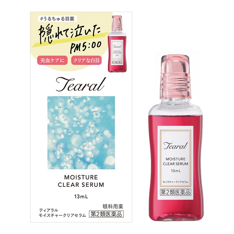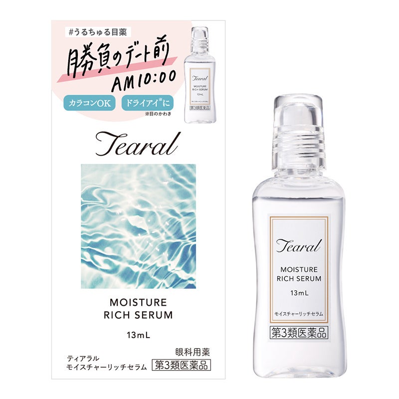 https://prcdn.freetls.fastly.net/release_image/12002/862/12002-862-fdd4a4a0e1a25f26dc5dd3ed3787d460-800×800.jpg Product Features and Overview ■Moisture Rich Serum Contains seven mineral ions found in tears for long-lasting moisture Contains a balanced blend of mineral ions, including sodium, potassium, and magnesium, to closely resemble human tears. This hypoallergenic formula is also suitable for children. It feels just like applying tears, providing moisture to dry eyes. Price:1,320 yen (tax included) Volume:13mL Classification:Class 3 OTC drug (artificial tears) Effects and Benefits Eye fatigue, tear production support (dry eyes), discomfort when wearing hard or soft contact lenses, blurred vision (when there is a lot of eye discharge, etc.) *Can be applied to all contact lenses, including colored contact lenses, or to the naked eye. ■Moisture Clear Serum Contains 8 active ingredients, including vitamins Contains vitamins*1 that stimulate the focus-adjusting muscles and vitamins*2 that promote metabolism. It also contains ingredients that reduce redness*3 and encase and protect the cornea.*4 The red color is derived from vitamins. Price:1,320 yen (tax included) Volume:13mL Classification:Class 2 OTC drug Effects and Benefits: Eye fatigue, conjunctival congestion, prevention of eye diseases (after swimming, when dust or sweat gets in the eyes, etc.), eye inflammation caused by ultraviolet rays or other light (snow blindness, etc.), blepharitis (inflammation of the eyelids), discomfort when wearing hard contact lenses, itchy eyes, blurred vision (when there is a lot of eye discharge, etc.) *Can be used with bare eyes and when wearing hard contact lenses. *1 Cyanocobalamin (vitamin B12) *2 Pyridoxine hydrochloride (vitamin B6), panthenol (vitamin B5) *3 Tetrahydrozoline hydrochloride *4 Chondroitin Sulfate Sodium ■Moisture Refresh Serum Contains 8 active ingredients to relieve eye fatigue, providing the highest level of refreshing sensation*1 Contains ingredients that relax the focusing muscles*2, ingredients that promote eye metabolism and provide nutrients*3, and ingredients that suppress inflammation*4. Price:1,320 yen (tax included) Volume:13mL Classification:Class 2 OTC drug Effects and Benefits: Eye fatigue, conjunctival congestion, prevention of eye diseases (after swimming, when dust or sweat gets in the eyes, etc.), eye inflammation caused by ultraviolet rays or other light (snow blindness, etc.), blepharitis (inflammation of the eyelids), discomfort when wearing hard contact lenses, itchy eyes, blurred vision (when there is a lot of eye discharge, etc.) *Can be used with bare eyes and when wearing hard contact lenses. *1 In our eye drops *2 Neostigmine methylsulfate *3 Pyridoxine hydrochloride, taurine, magnesium and potassium L-aspartate *4 Epsilon-aminocaproic acid, dipotassium glycyrrhizinate Release Date/Distribution Stores: Drugstores, variety stores, Don Quijote, and general merchandise stores nationwide (some stores excluded) Online: Amazon (not eligible for this campaign) https://tearal.jp/shoplists/ Tearal Moisturizing eye drops for beautiful eyes Tears eye care brand “Tearal” Instagram: https://www.instagram.com/tearal.official/ X: