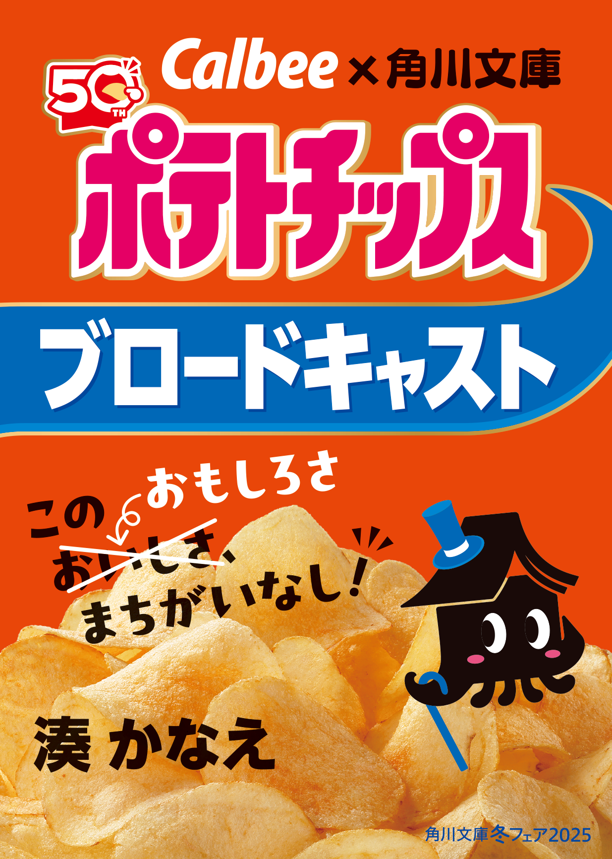 https://prcdn.freetls.fastly.net/release_image/7006/17974/7006-17974-6668c29038842eb5d9ca38bfdd9b8db3-1235×1732.png “Broadcast” by Kanae Minato A miraculous collaboration has been completed between Calbee potato chips, a snack loved by generations, and Kadokawa Bunko. • Once you start eating and reading, you won’t be able to stop: “Potato Chips Consommé Punch” x “Exit Game” • Unique flavor and unique world view: “Potato Chips with Seaweed and Salt” x “Kamogawa Horumo” • Guaranteed deliciousness and fun: “Lightly Salted Potato Chips” x “Broadcast” These three super-wide sashes, each featuring a potato chip packaging design, are so cute you’ll want to collect them all. There’s also a giveaway campaign where you can enter a draw to win a set of three special clear file folders. Check the obi for details!