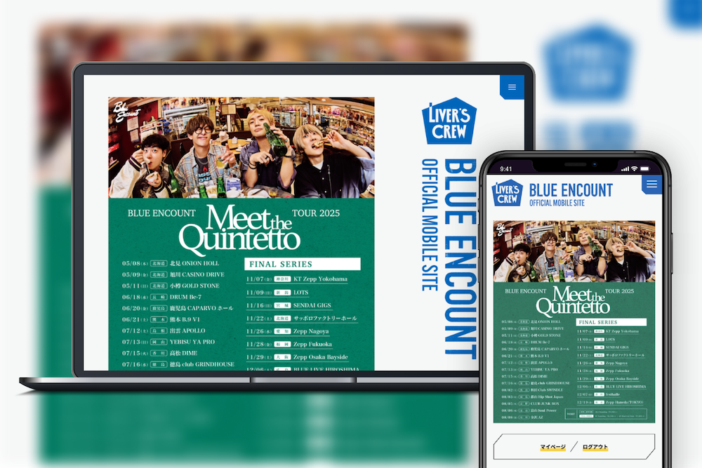 performances and down-to-earth, message-filled lyrics resonate with many. They have also composed numerous tie-in songs, including the opening theme “DAY×DAY” for the anime “Gintama,” as well as theme songs for dramas, anime, and movies, and are a regular performer at major festivals. In addition, starting in November 2025, they will be holding the FINAL SERIES of their nationwide tour “BLUE ENCOUNT tour 2025 “Meet the Quintetto”,” promoting their 5th full album, “Alliance of Quintetto”! Expectations are high for their new challenges and further growth. We’ve not only renewed “LIVER’S CREW” and completely updated the site design, but We’ve added new content, including a “GALLERY” featuring exclusive live photos and “Omikuji”