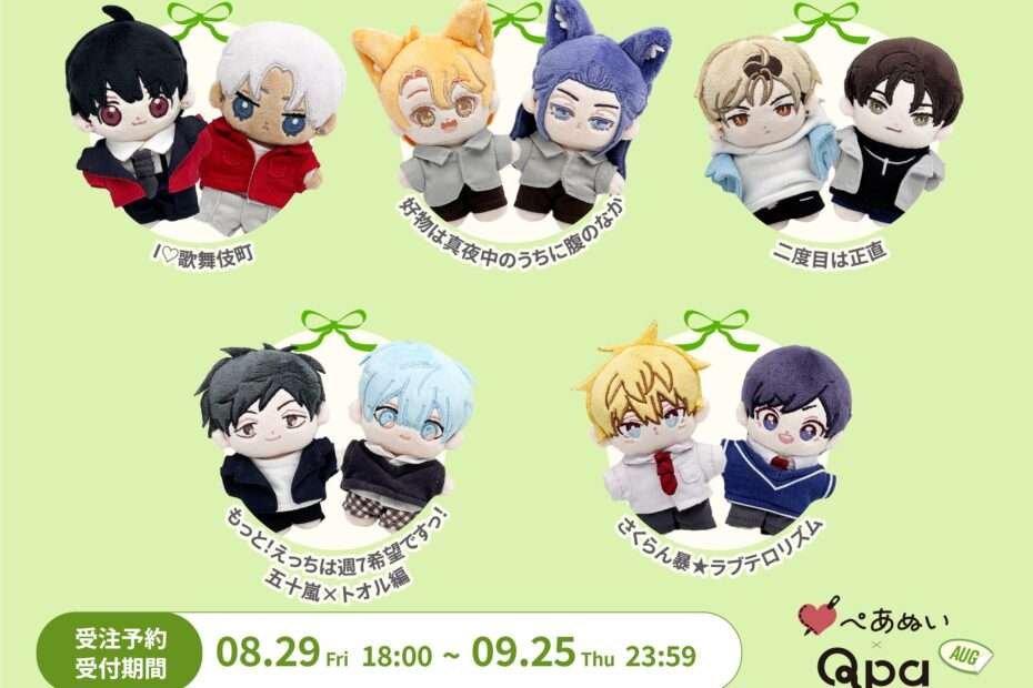 Takeshobo Co., Ltd. “Qpa x Pair Plush” More than 120 characters from 41 popular Qpa artists are now available as plush toys! Pre-orders for August’s collection are now open!2025-08-292025-08-29All