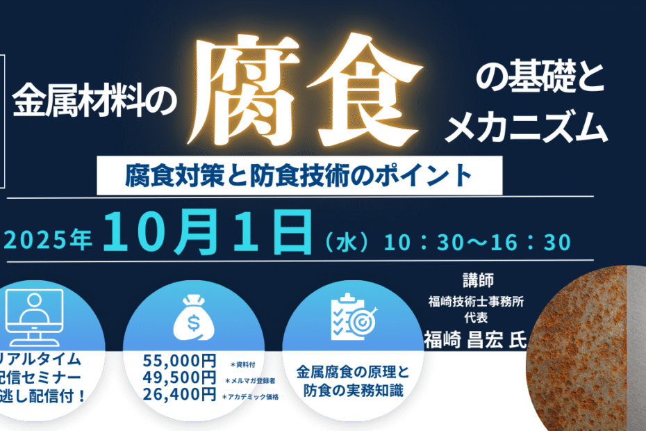 CMC Research Live Streaming/Zoom Seminar on “Fundamentals and Mechanisms of Metallic Corrosion, and Key Points of Corrosion Prevention and Prevention Technologies” to be Held on Wednesday, October 1st, Organized by CMC Research, Inc.2025-08-292025-08-29All