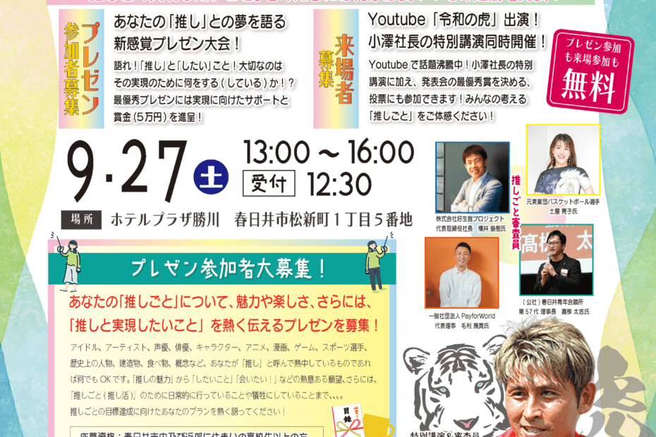 PUMPMAN Inc. Tatsuya Ozawa, who has been making waves for appearing on “Reiwa no Tora,” will be appearing at the Kasugai Junior Chamber of Commerce event, where he will give a special speech encouraging young people.2025-08-292025-08-29All